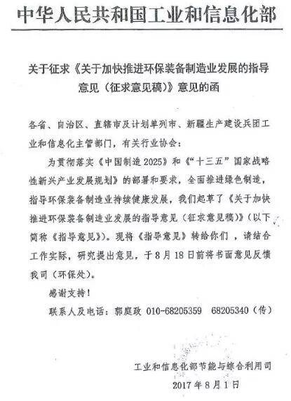 日前,工信部印发《关于加快推进环保装备制造业发展的指导意见(征求意见稿)》。《征求意见稿》提出加快推进环保装备制造业发展,涉及大气污染防治装备、水污染防治装备、土壤污染修复装备等八个重点领域。详情如下: