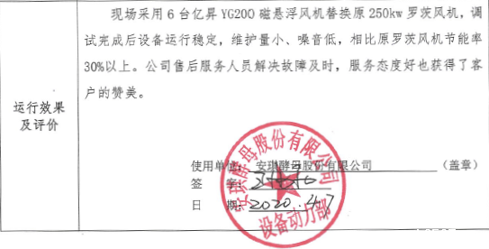 Through operating test in 3 months, it is proved that ESURGING maglev blower operates stably, and can save more than 40% of energy than roots blower, more than 25% than foreign screw blower; it has significant energy conservation performance.